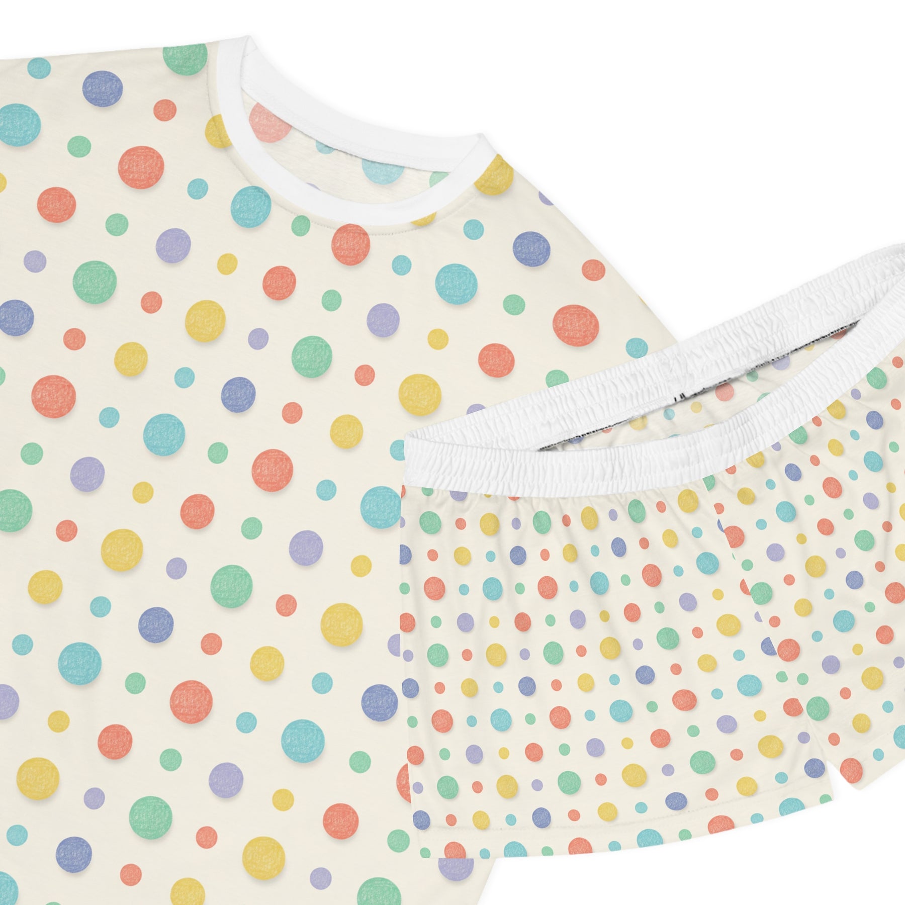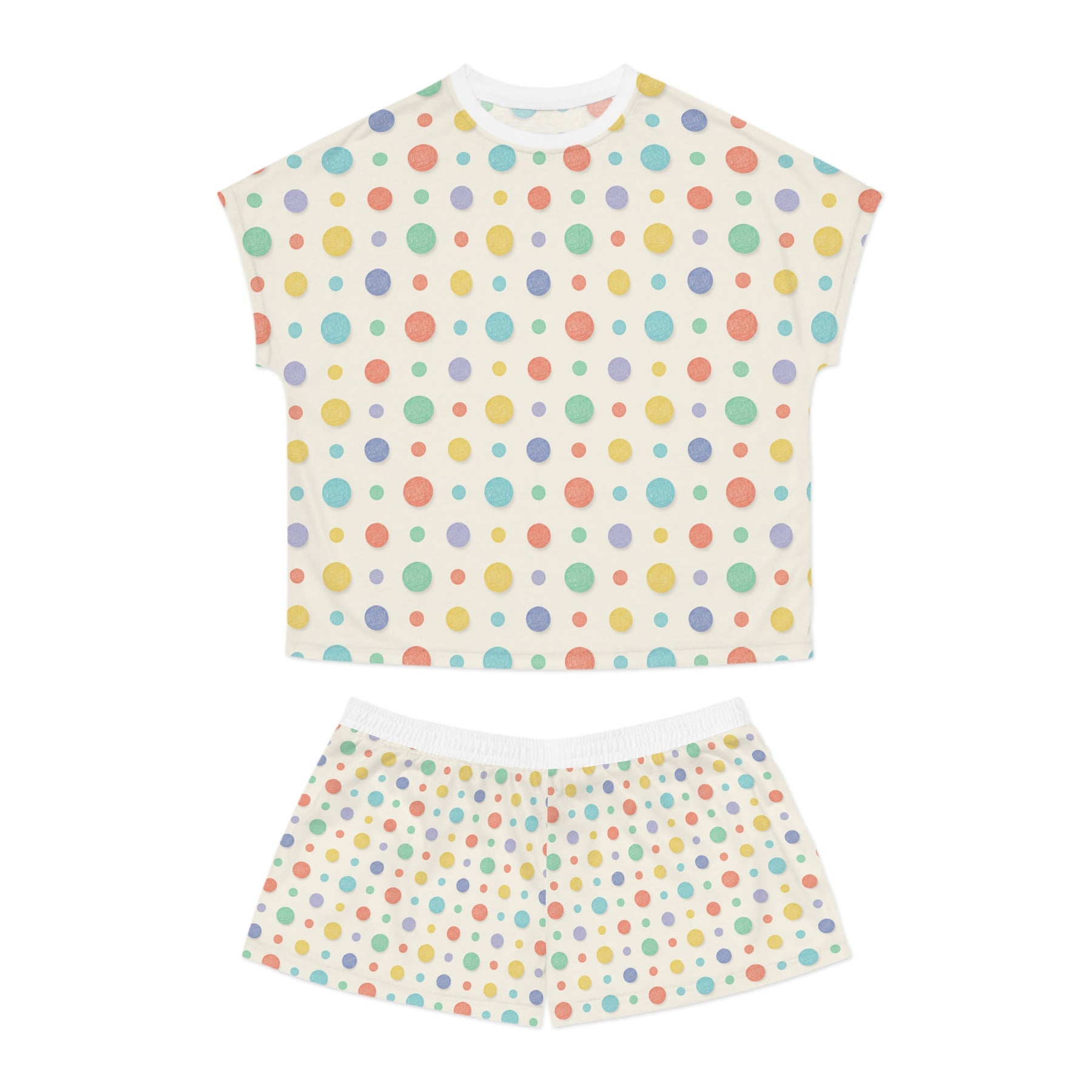 Wear these pastel polka dot pajamas and let the room soften. Lightweight shorts and a short-sleeve top move like a gentle evening breeze — breathable, slightly stretchy, and made for slow conversations and late-night reads. The relaxed silhouette with a ribbed collar and seamless sleeves gives a roomy, tucked-in-against-the-shoulder feel without feeling bulky. An elastic, soft waistband keeps comfort steady through shifting positions and midnight stretches. Small details — matched seam thread and a discreet sewn-in label — keep the look clean so the soft dots take center stage. Choose either a black or white collar to subtly shift the contrast and mood.